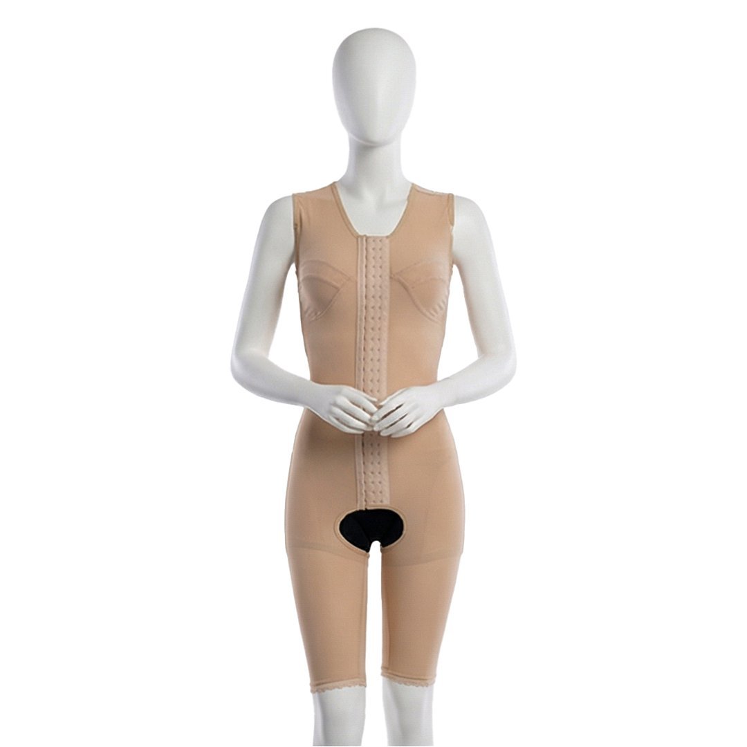 A post-operative garment designed to provide compression, stabilization, and support to the entire torso, hips, and thighs. It extends from the shoulders down to just above the knees, offering full coverage for comprehensive support after procedures such as tummy tucks, liposuction, or body contouring,typically made from elastic, breathable materials with adjustable closures or zippers, it helps reduce swelling, support healing tissues, and give a smooth, contoured appearance.