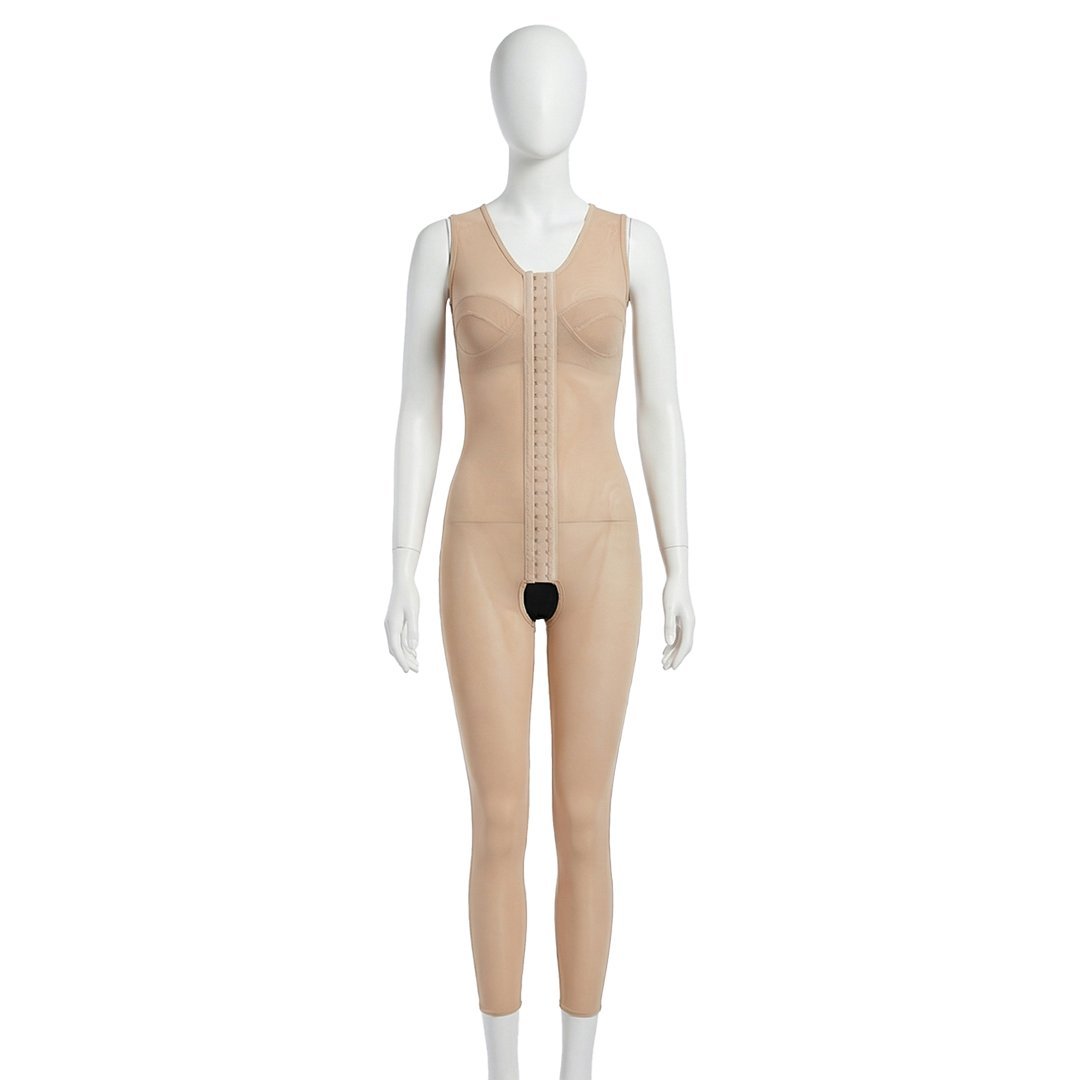 A sleeveless, ankle-length bodysuit designed as a liposuction garment is a specialized post-surgical clothing made from comfortable, breathable fabric. It offers full-body coverage from the shoulders to the ankles, without sleeves, providing compression and support to aid in healing after liposuction procedures. This type of bodysuit helps manage swelling, improve skin retraction, and offers a sleek, supportive fit during recovery.