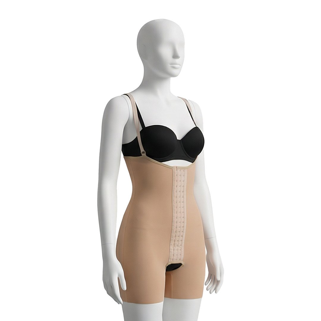 A post-operative garment designed to provide compression, stabilization, and support to the entire torso, hips, and thighs. It extends from the shoulders down to just above the knees, offering full coverage for comprehensive support after procedures such as tummy tucks, liposuction, or body contouring,typically made from elastic, breathable materials with adjustable closures or zippers, it helps reduce swelling, support healing tissues, and give a smooth, contoured appearance.