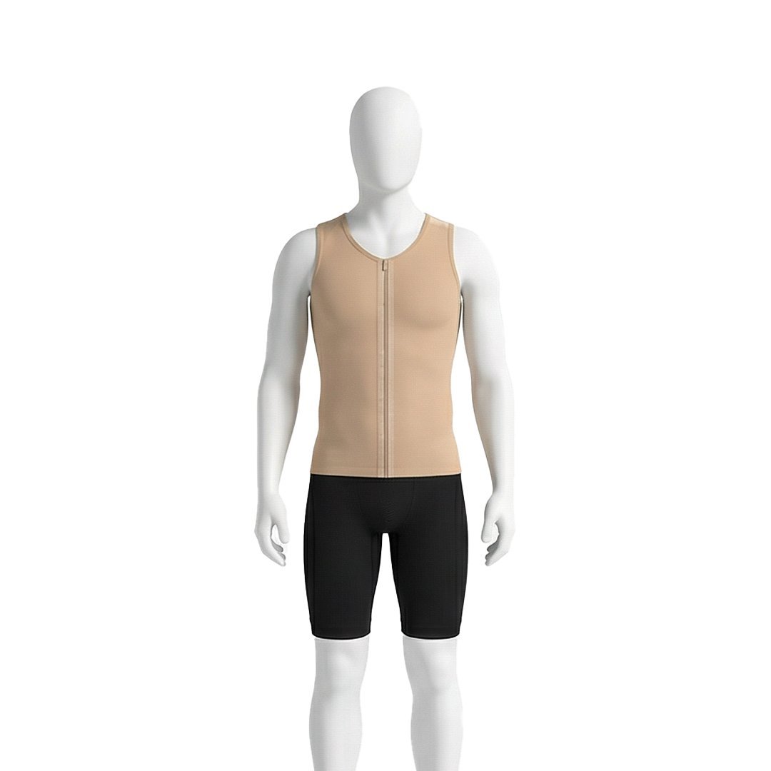 A sleeveless vest designed as a liposuction garment offers essential support and compression to promote healing in treated areas. Key features include gentle compression to reduce swelling, a sleeveless design for ease of movement, and materials that are soft, breathable, and stretchy to accommodate body changes during recovery. Many vests also come with adjustable straps for a customizable fit and provide coverage for the abdomen and upper body. These garments enhance recovery by improving circulation and reducing fluid retention while being discreet enough to wear under clothing. It's important to consult with your surgeon to select the right garment for your needs.